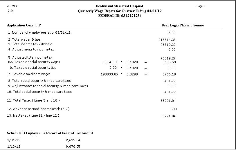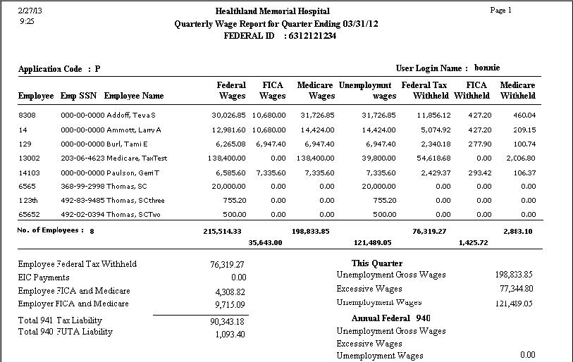 This report prints each employee who had earnings during the quarter with their employee number, social security number, name, federal, FICA and Medicare taxable wages, federal unemployment wages, and federal, FICA and Medicare withholdings. A second report shows total amounts that need to be reported for the 941.