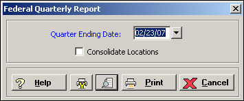 The Federal Quarterly Report window is used to generate a report that shows employee federal taxes for a specific quarter. The Federal Quarterly Report has the information needed to file the 941 information with the federal government.