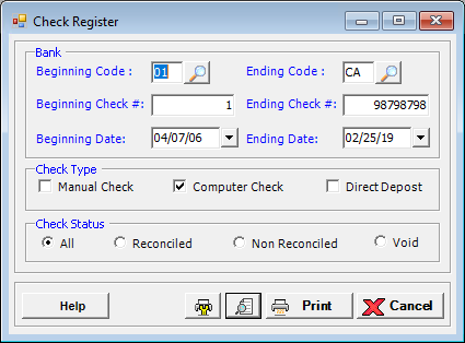 Enter a range of check numbers to include in the report. By default, all check numbers are included in the report based on the selected bank codes. To edit, enter the first check number of the range in the Beginning Check # field, and the last check number of the range in the Ending Check # field.
