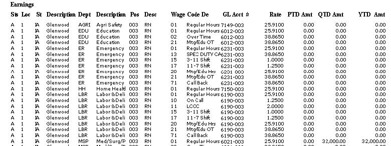 Employee Wage Codes - Shows each employee with the location, department, position, and wage code that is set up for the employee, the general ledger expense account, wage and unemployment states, and pay rate.