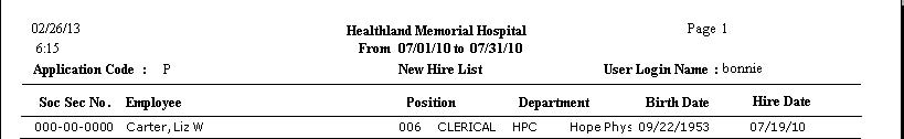 New Hire Report - Shows each employee who was hired in the selected date range. This report contains the employee's Social Security number, name, primary position, department, birth date, and hire date.