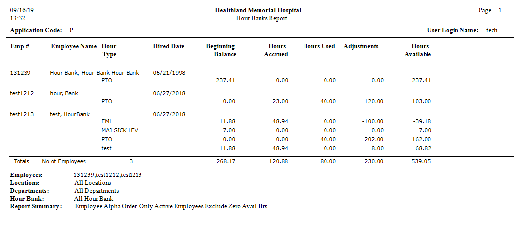 The Hour Banks report displays the current balance for the various Hour Banks that have been set up.