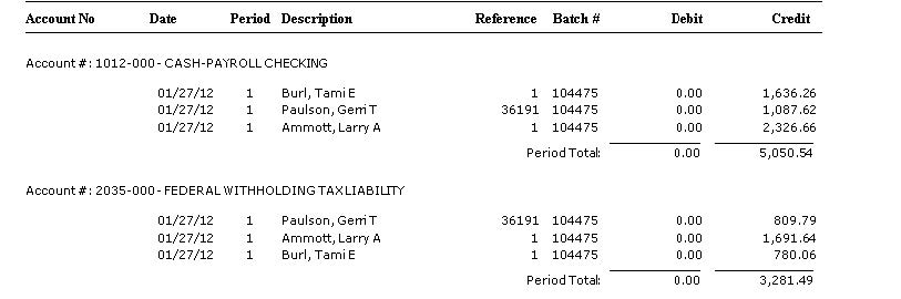 The Payroll Journal in Batch order shows the Batch Number followed by columns of Account No., Date, Period, Description, Reference (check number), Debit and Credit amounts. There are totals for the batch and report. The report in Account No. order shows the Account No. and description followed by columns of Date, Period, Description, Reference (Check number), Batch No., Debit and Credit amounts.